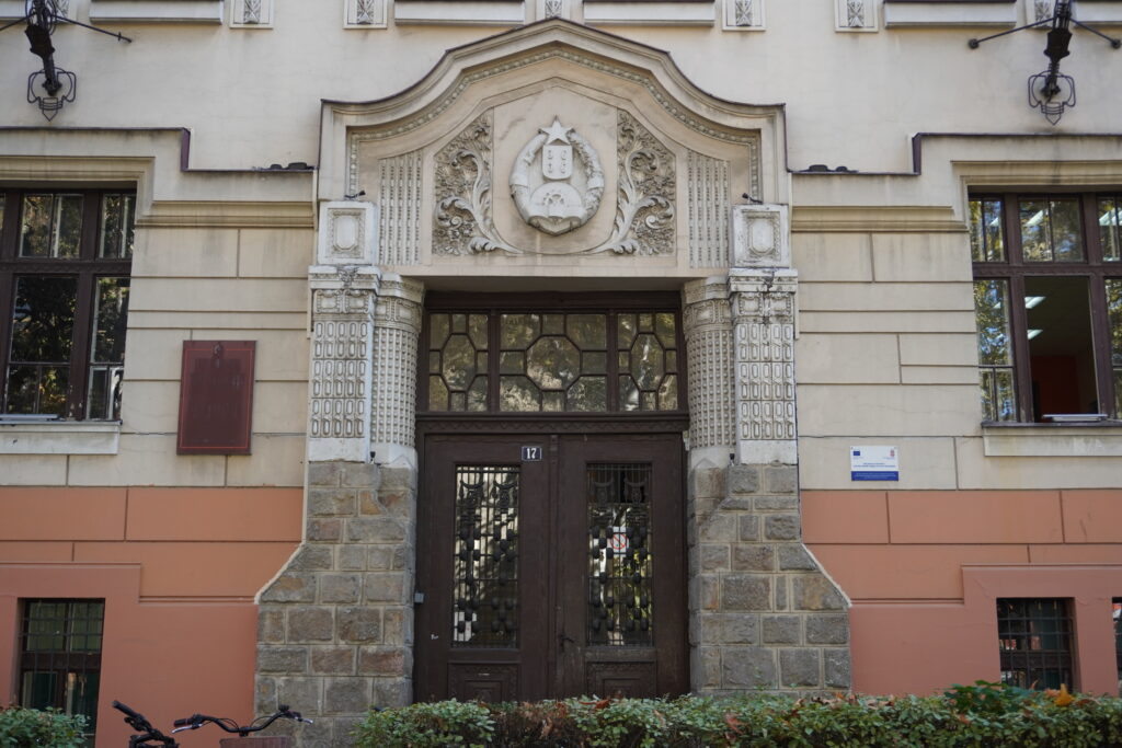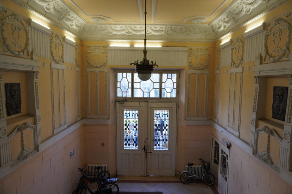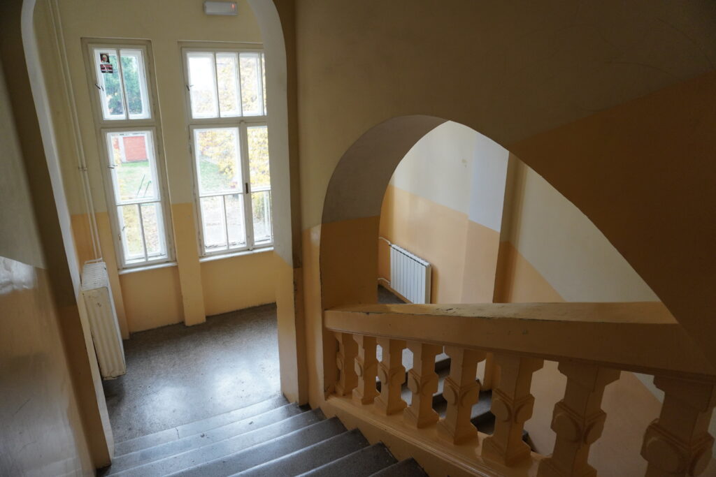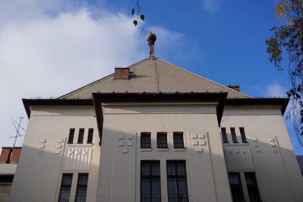 Prostorna organizacija izvedena je sa prostorijama u nizu i širokim hodnicima, dok su vertikale fasada dodatno istaknute imitacijom kamenih kvadera.