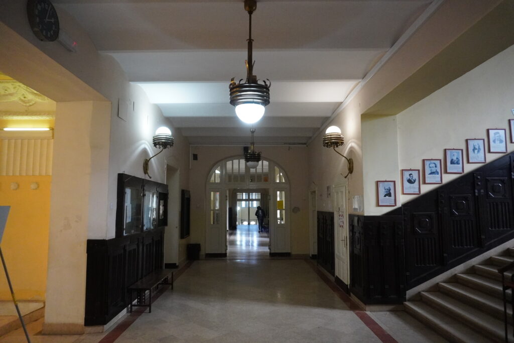 Unutrašnjost je oblikovana u funkciji školske ustanove – široki hodnici sa učionicama u nizu, središnje stepenište i vestibul sa stubovima i kapitelima.
